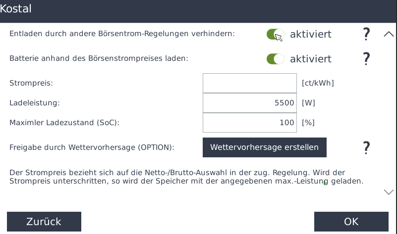DurchMitdiesedieser Option wirdeindas Entladen der Batterien verhindert, wenn eine andere Regelung aufgrunddes dortihres eingestellten Börsenstrompreisesaktiviertaktivwird.- wird