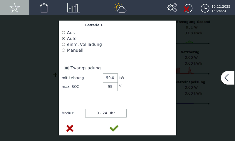 Hier können SieErzwingt eine einmalige Volladungerzwingen.aufDie100Batterie wird dann%, unabhängig vonBörsenstromPV-Erzeugung undPV-Erzeugung sofort auf 100% geladenBörsenstrompreisanschließendNachspringtAbschluss der Volladung wechselt das Widget automatisch wiederaufin denvorzuvorderaktivenVolladung aktivierten StatusModus
