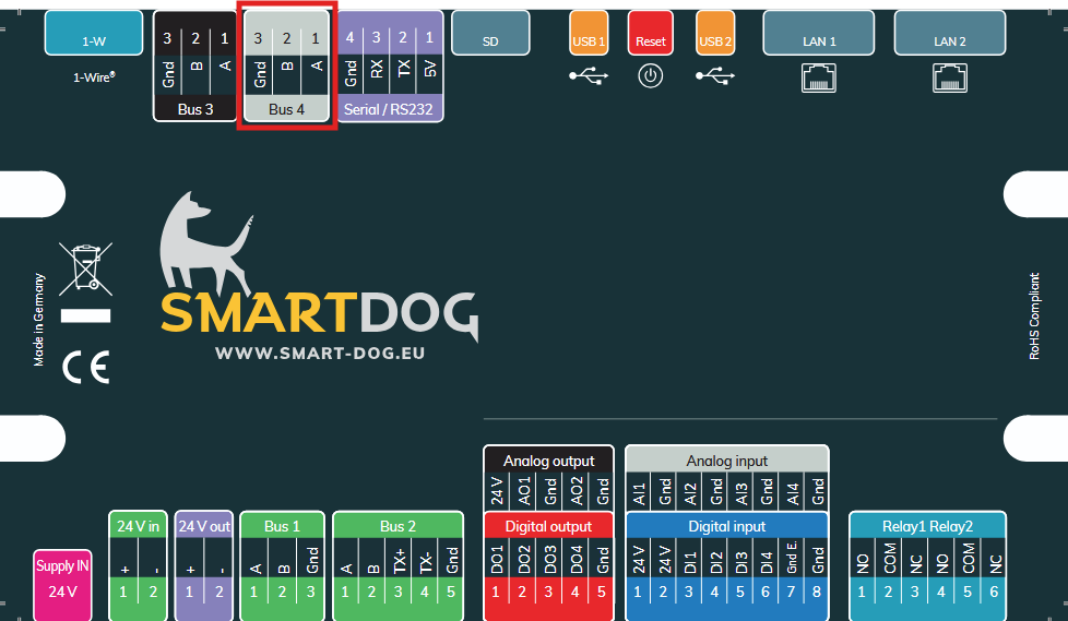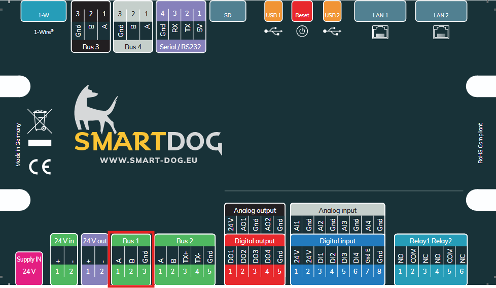 Aktivieren Sie den Abschlusswiderstand, wenn der SmartDog das letzte Gerät am Bus ist