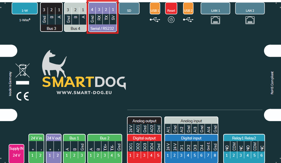 Hier können Sie einen Seriellen Anschluss verwenden oder mit einer Schnittstellenerweiterung [Artikelnummer 00000] einen weiteren RS485/422 BUS realisieren Buskommunikation