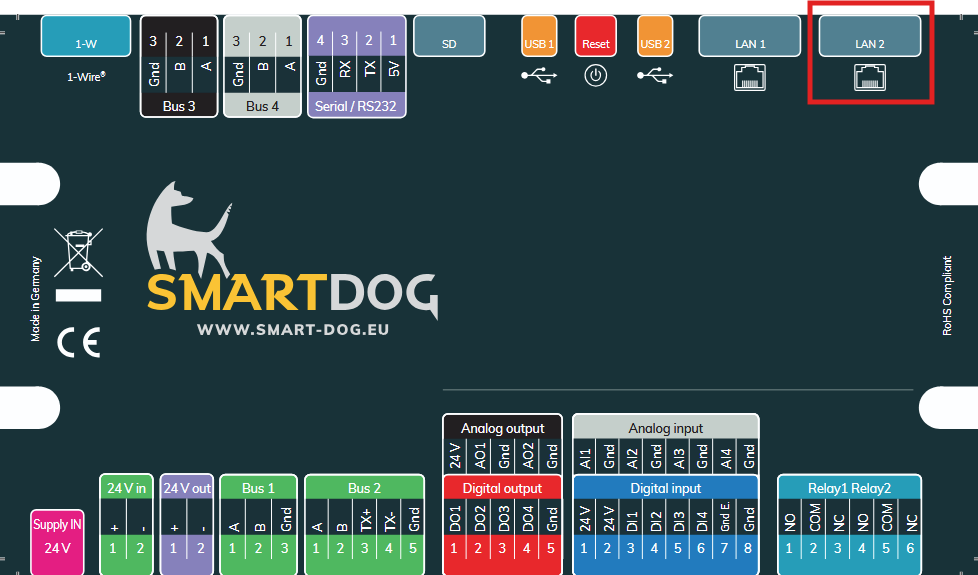 Der zweite Anschluss kann entweder als Switch (maximale Bandbreite: 50 Mbit) genutzt werden, oder bei einer Anlage mit IEC-104 Fernwirktechnik für den Anschluss an das Gateway des Energieversorgers