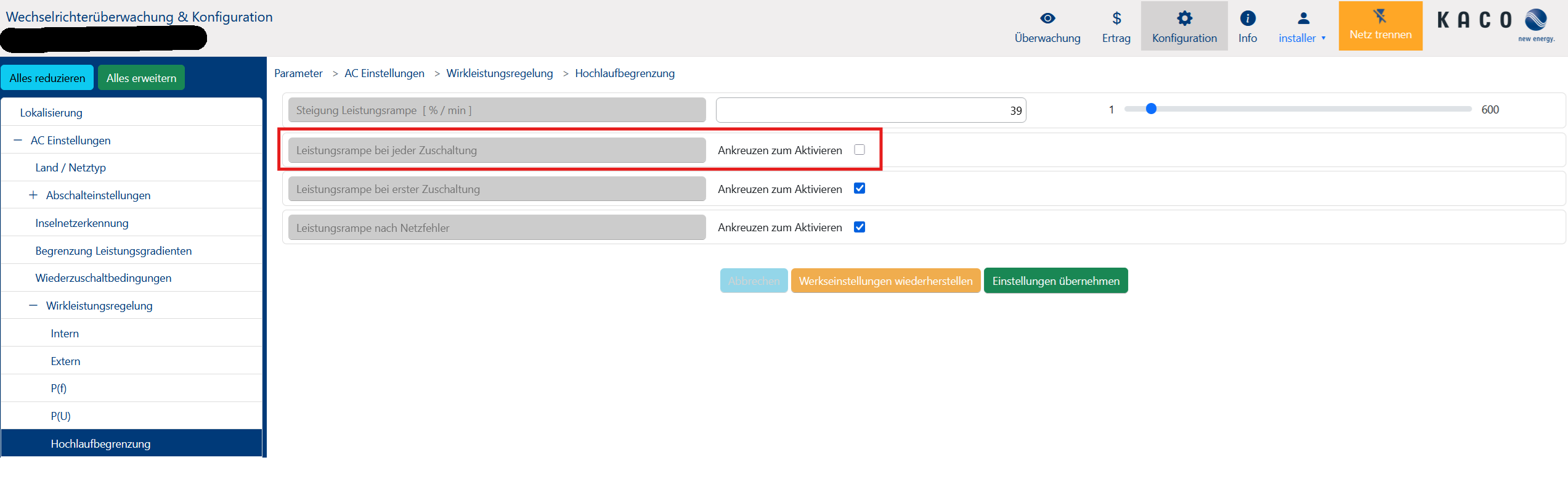 Wenn eine Einspeisebegrenzung am Netzverknüpfungspunkt umgesetzt werden muss, muss die folgende Funktion deaktiviert werden: