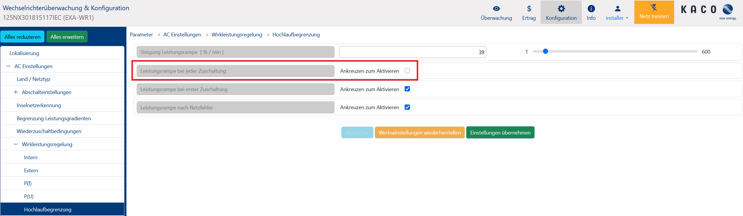 Wenn eine Einspeisebegrenzung am Netzverknüpfungspunkt umgesetzt werden muss, muss die folgende Funktion deaktiviert werden: