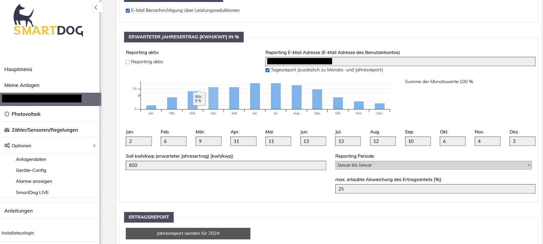 Unter Tagesreport können Sie auswählen, ob Sie zusätzlich zum Monats- und Jahresreport auch tägliche Ertragsberichte per E-Mail erhalten möchten