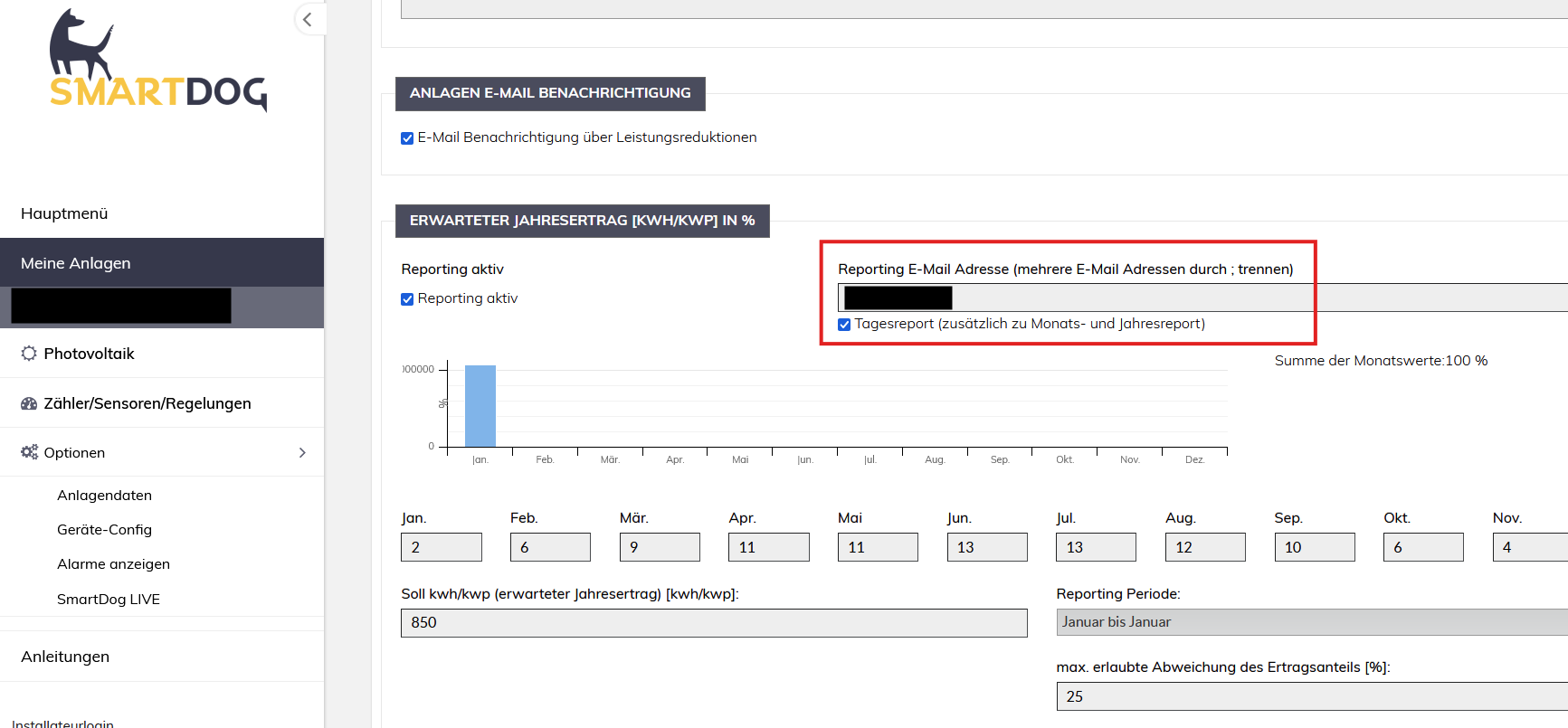 - Hier können Sie nun die Reporting E-Mail Adresse abändern oder mit ; eine weitere E-Mail Adresse hinzufügen