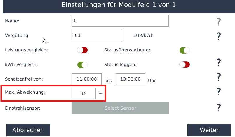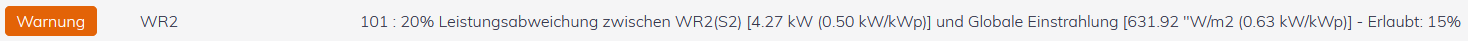 - Zwischen dem angegebenen Wechselrichter und dem Einstrahlsensor besteht eine Ertragsabweichung, die den zulässigen hinterlegten Grenzwert von überschreitet