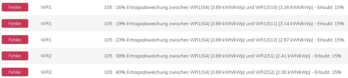 • Zwischen den angegebenen Wechselrichtern besteht eine Ertragsabweichung, die den zulässigen hinterlegten Grenzwert von überschreitet