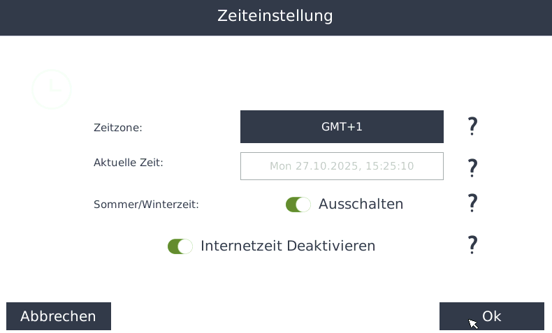 Im Onlinebetrieb wird bei aktivierter Internetzeit die Uhrzeit vom Timeserver geladen und kann nicht verändert werden
