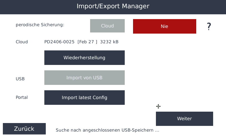 Beim Import/Export Manager haben Sie die Möglichkeit eine perodische Sicherung zu aktivieren. Diese Sicherung kann in die Cloud oder auf dem USB-Stick übertragen werden
