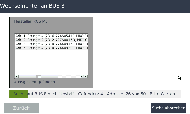 Falls Sie mehrere Wechselrichter angeschlossen und gefunden haben wiederholt sich dieser Wizard nun für jeden Wechselrichter