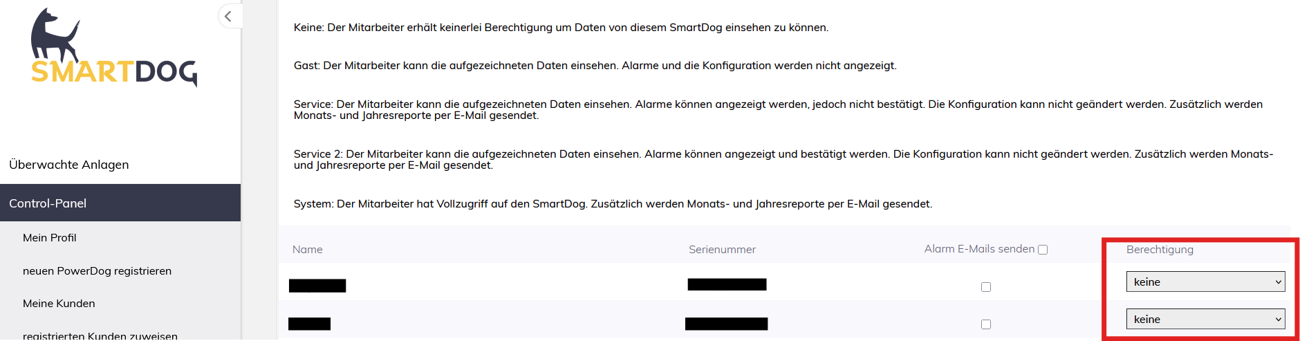Legen Sie fest, auf welche Anlagen Ihr Monteur Zugriff erhalten soll und welche Berechtigungsstufe ihm zugewiesen wird: