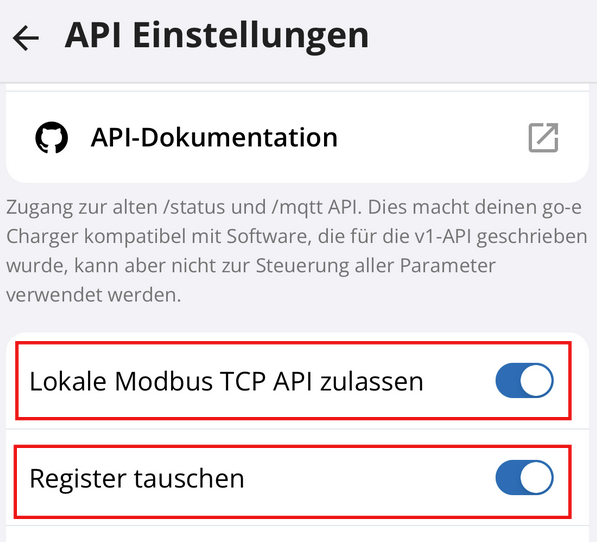 - aktivieren Sie unter dem Reiter Verbindung in der Ebene API Einstellungen die Modbus-Kommunikationsschnittstelle Lokale Modbus TCP API zulassen