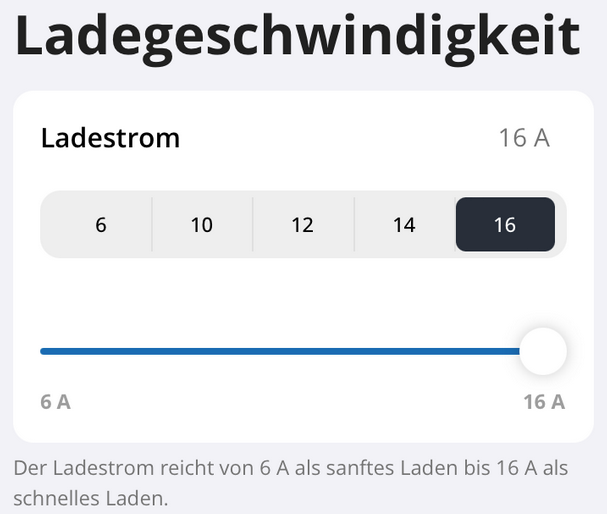 - die max. Stromgrenze der Ladestation kann über die App oder direkt über die Bedientaste an der Station eingestellt werden