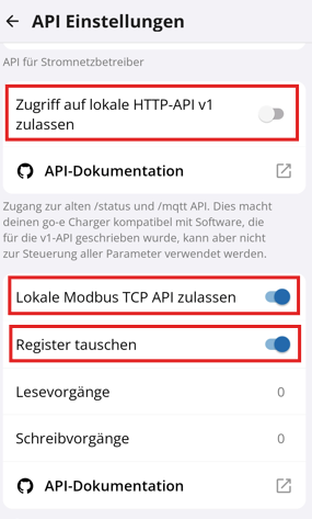 - aktivieren Sie unter dem Reiter Verbindung in der Ebene API Einstellungen die Modbus-Kommunikationsschnittstelle Lokale Modbus TCP API zulassen sowie Zugriff auf lokale HTTP-API v1 zulassen