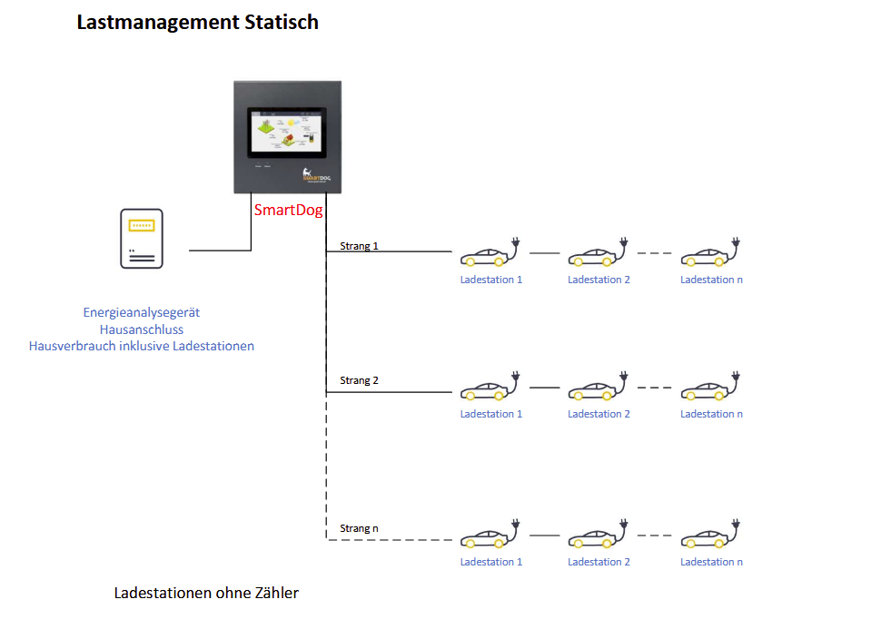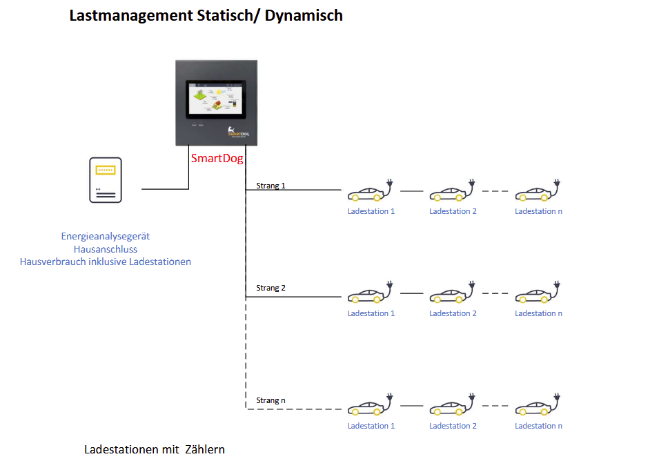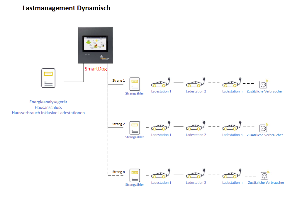 Mit dem eingebundenen Stromzähler an der Übergabestation (Liste kompatibler Zähler für SmartDog) wird die insgesamte aktuelle Leistungsaufnahme ermittelt und mit einem Vorgabewert verglichen. Wird der maximal erlaubte Strom überschritten (zusätzlicher Verbraucher wird aktiviert oder ein neues Auto wird an eine Ladestation angeschlossen), werden die Ladestationen zurück geregelt. Wenn der Strom soweit reguliert werden muss, dass jede Ladestation mit dem Mindeststrom angesteuert wird, werden einzelne Ladestationen ausgeschaltet. Dies erfolgt anhand der Prioritäten, die entweder manuell festgelegt oder bei „First Plug, First Charge“ automatisch ermittelt wurden. Zusätzlich werden auch die pro Gruppe benötigten Ströme mit einem Vorgabewert verglichen und die Ladeströme der Stationen innerhalb einer Gruppe gegebenenfalls reduziert oder abgeschaltet, bis wieder genug Strom verfügbar ist. Sobald wieder ausreichend Strom an der Übergabestation oder innerhalb der Gruppe verfügbar ist, werden die ausgeschalteten Ladestationen anhand ihrer Prioritäten wieder aktiviert und die Ladeströme erhöht, bis entweder der Maximalwert jeder Ladestation, der maximale Ladestrom (bzw. die maximale Ladeleistung) in der Gruppe oder die Strombegrenzung am Zähler der Übergabestation erreicht ist.