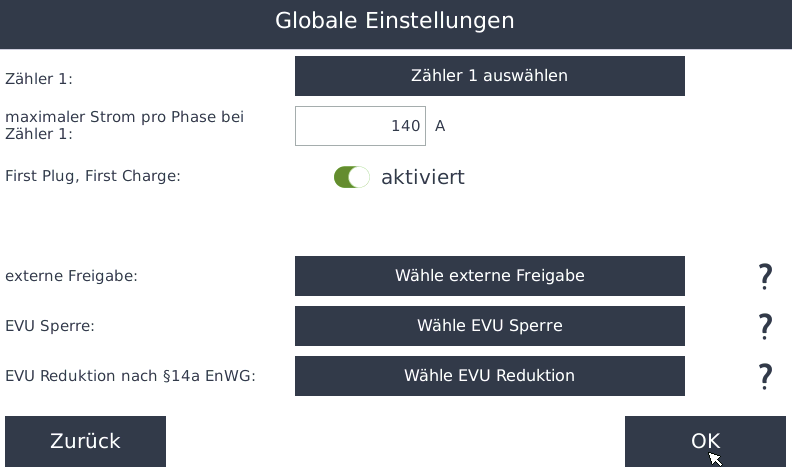 Klicken Sie auf Globale Einstellungen, um den Zähler an der Übergabestation zu konfigurieren. Geben Sie den maximal zulässigen Strom pro Phase ein. Die Positionierung der Zähler entnehmen Sie dem Anschlussschema