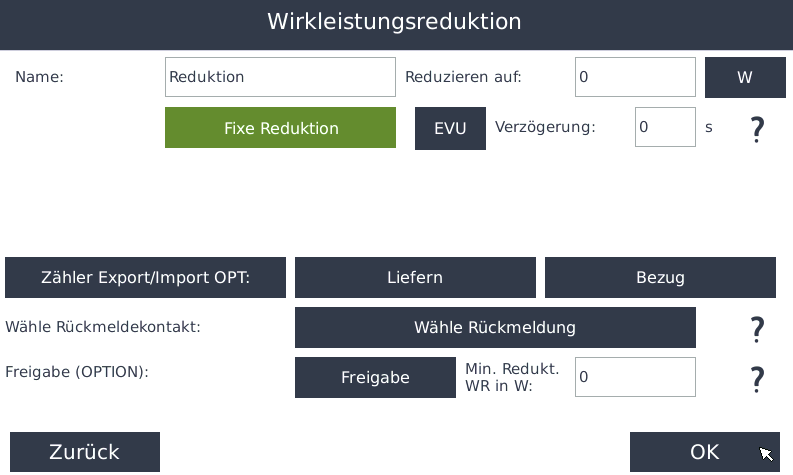 Hier können Sie eine einzelne Wirkleistungsreduktion umsetzen, entweder als festen Wert oder als Reduktion, die durch einen Digital- oder Analogeingang ausgelöst wird.
