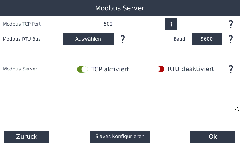 - Gehen Sie in die Geräteeinstellungen und anschließend auf Modbus Server