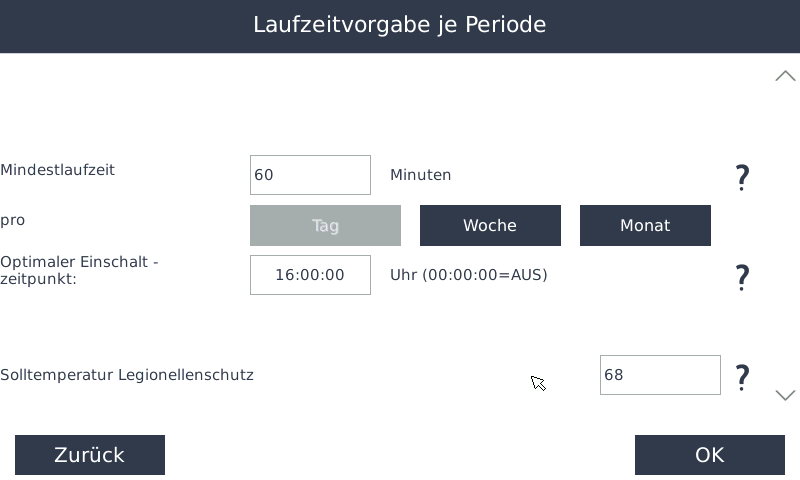 • Wird diese Temperatur über den gewählten Zeitraum (Tag / Woche / Monat) hinweg nicht erreicht, wird der Legionellenschutz automatisch ausgelöst