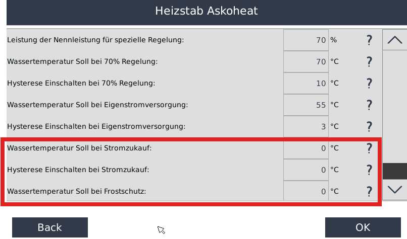 • Fällt die Wassertemperatur unter diesen Wert, ist ein Aufheizen mit Netzstrom erlaubt, bis die Temperatur den Wert Hysterese Einschalten bei Stromzukauf erreicht