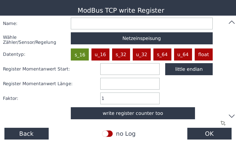 - Legen Sie fest, ob das Gerät über Single-Register oder Multi-Register angesprochen wird. Die genaue Information entnehmen Sie bitte der Betriebsanleitung des Gerätes