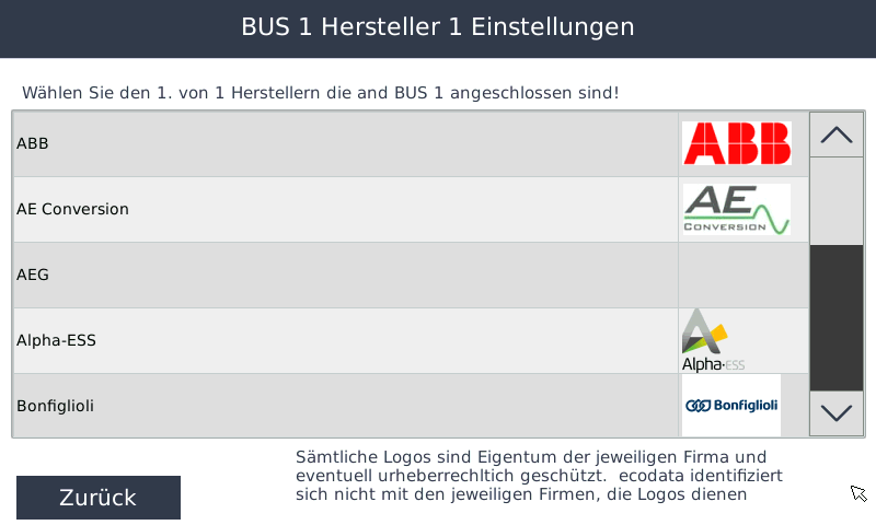 - Wählen Sie den Wechselrichterhersteller aus, der am gewählten Bus angeschlossen ist