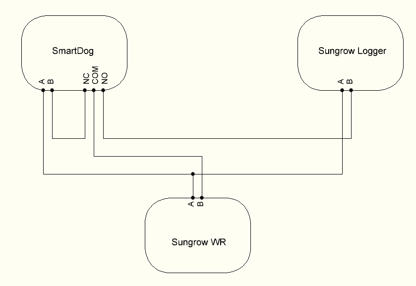 Die BUS-Leitung muss sowohl am SmartDog als auch am SmartLogger über ein Relais von SmartDog realisiert werden