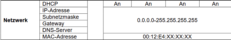 • Einstellungen für die Netzwerkparameter DHCP, IP-Adresse und Subnetzmaske können eingesehen und verändert werden