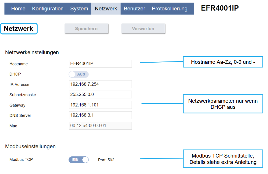 Ist das ZIEHL über Ethernet an ein Netzwerk angeschlossen, kann die Parametrierung auch über einen Webbrowser erfolgen