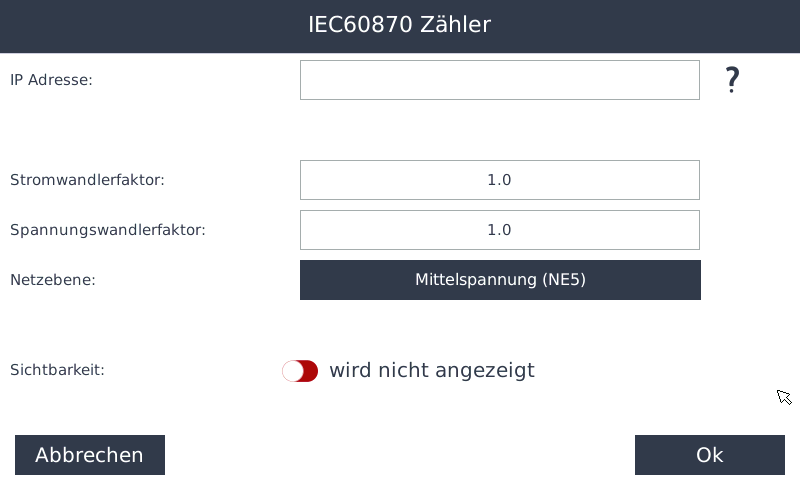 - Hier kann ein IEC-60870-Zähler angelegt werden – ein Energiezähler, der Messwerte und Zählerstände standardisiert über das Kommunikationsprotokoll IEC 60870 (z. B. -5-101/-104) an Leit- oder Energiemanagementsysteme überträgt