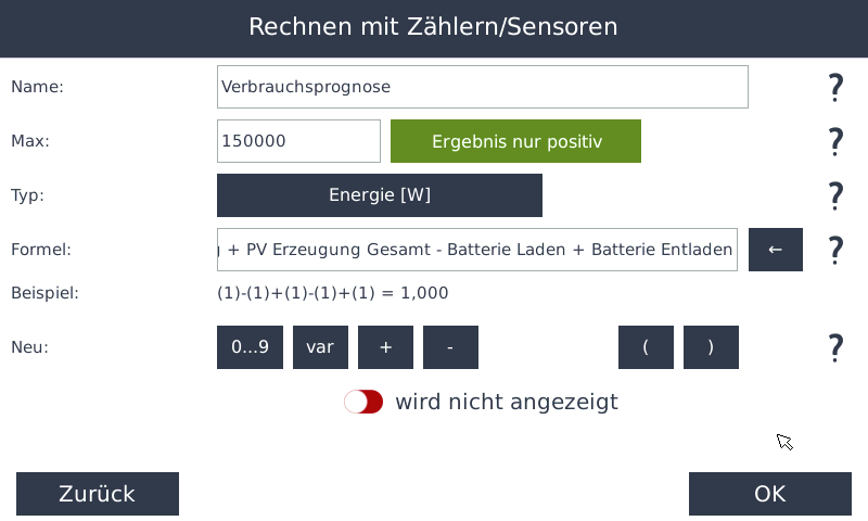 - Fügen Sie in die Formel per Subtraktion die Verbraucher ein, die nur bei PV-Überschuss aktiv sind: